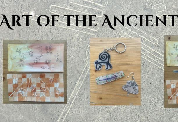 Come learn about the Nasca Lines in Peru, lasting designs left in the Atacama Desert by the ancient Inca over 2,000 years ago. Trace your favorites, choosing from hummingbirds, monkeys, lizards and abstract designs. Use watercolors to create earth-toned backgrounds and decorate them with your favorite Nazca lines. You may also create earrings, keychains, pins, charms and bookmarks.