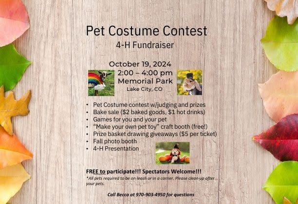 Other happenings for this 4-H event include a bake sale ($2 baked goods, $1 hot drinks), games for you and your pet, “Make your own pet toy” craft booth (free!), prize basket drawing giveaways ($5 per ticket) and fall photo booth. It's free to participate and all are welcome. All pets are required to be leashed and cleaning up after your pet is expected. Please contact Rebecca Kaminski at 970-903-4950 for further questions.